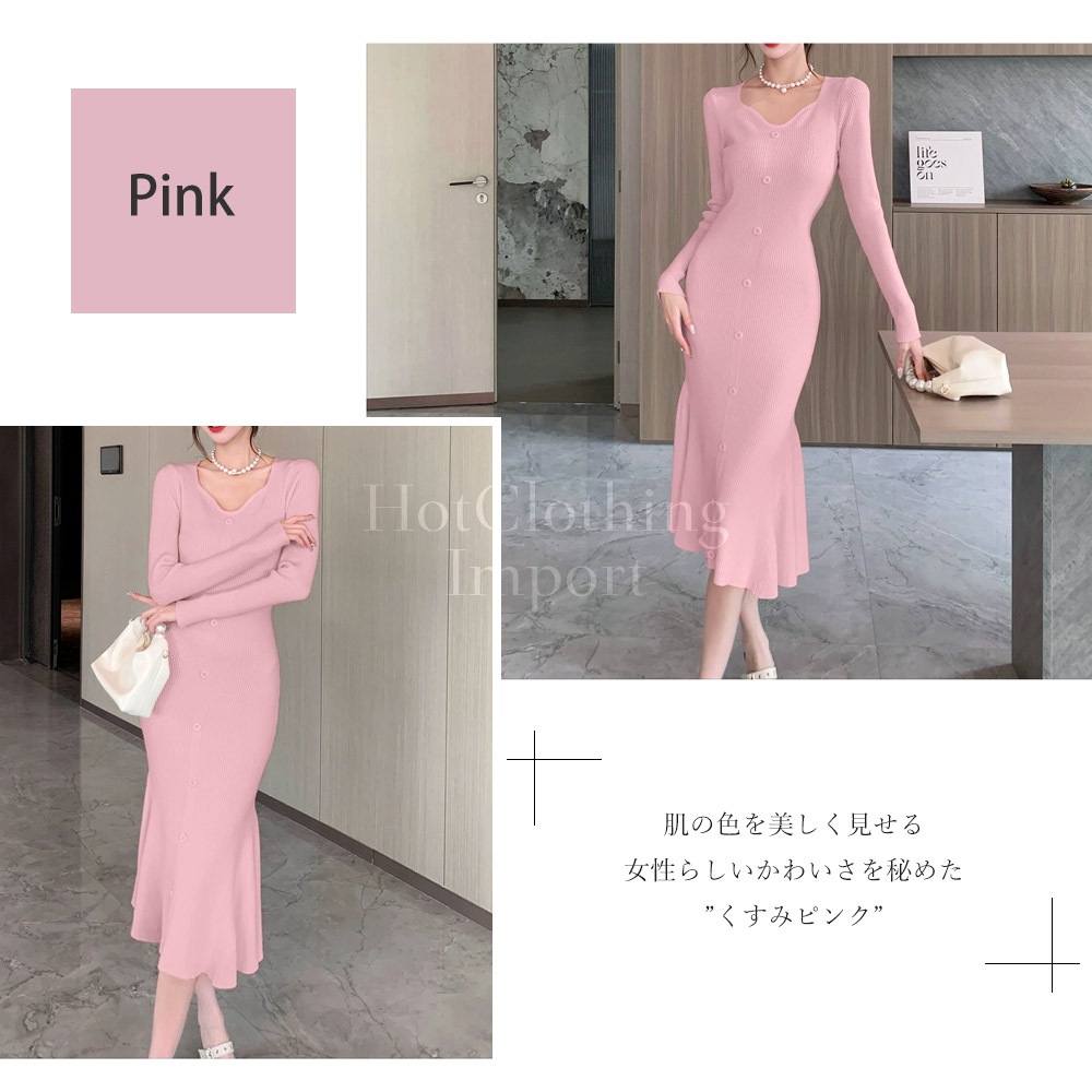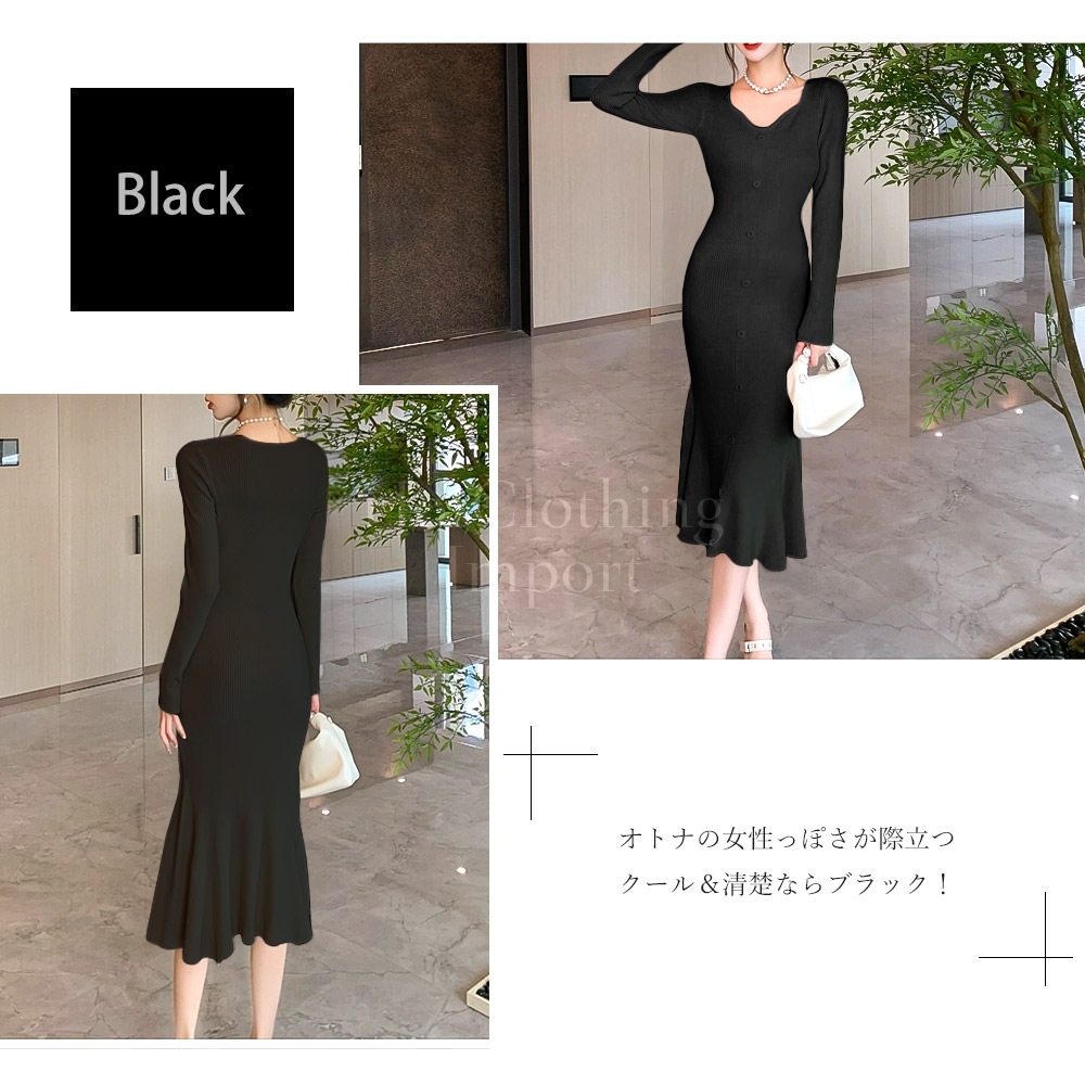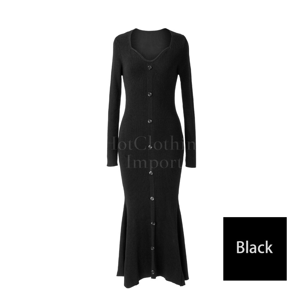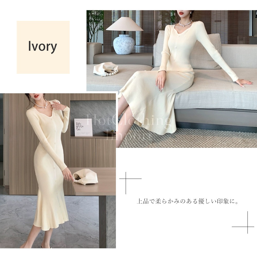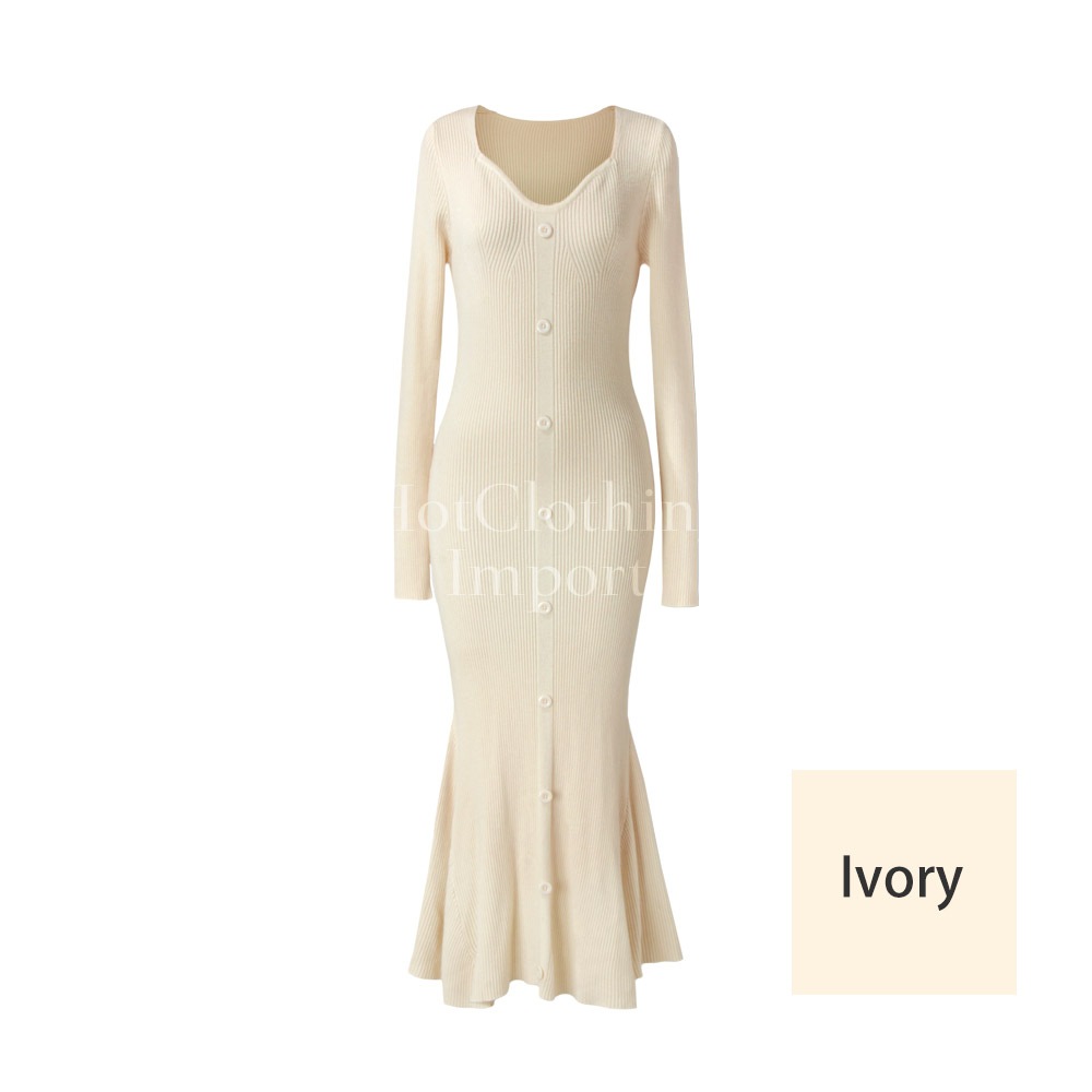 フィッシュテール Vネック ニットワンピース セクシー マキシ丈 ロング Fishtail V-neck knit dress cop-23004