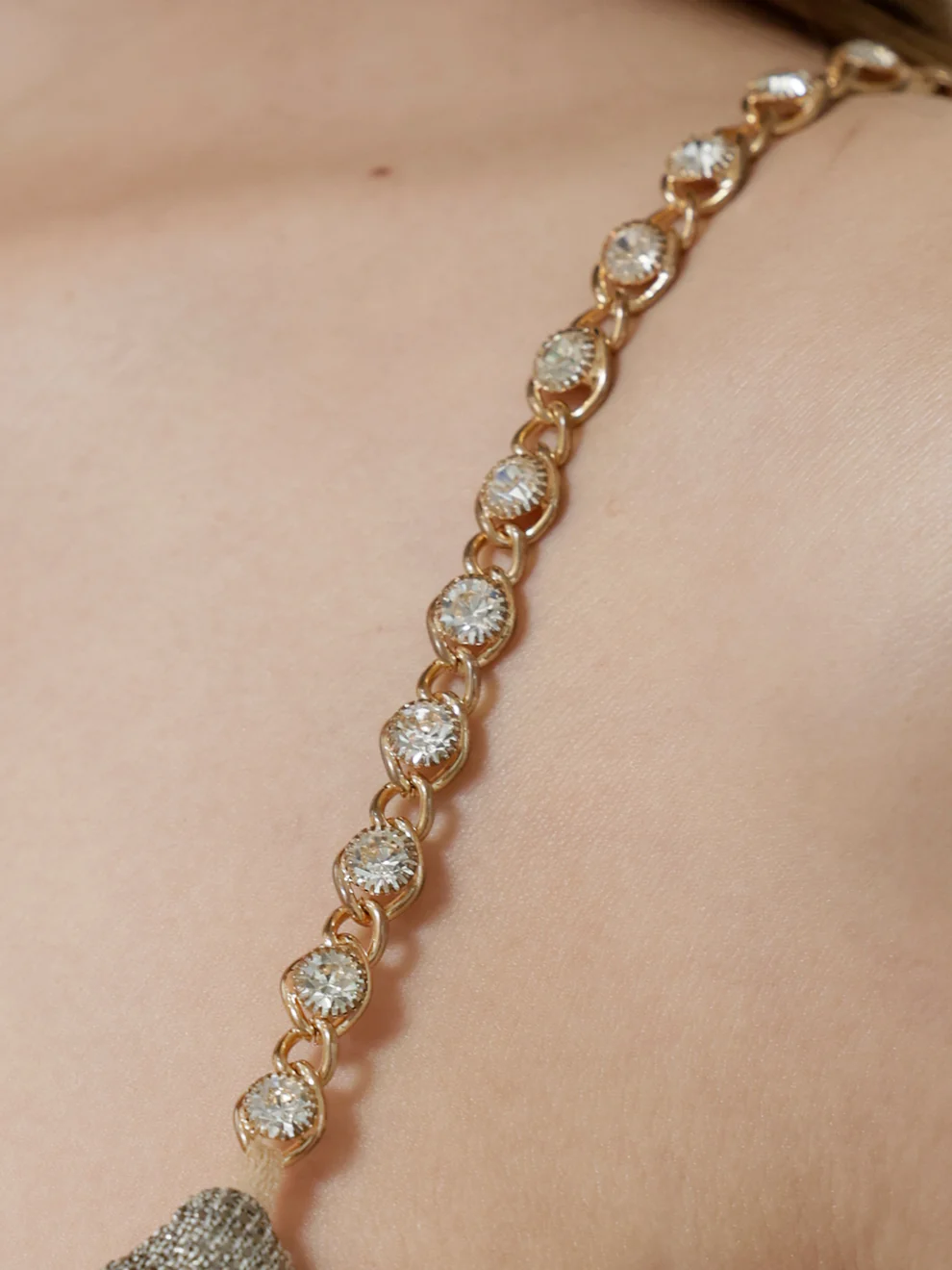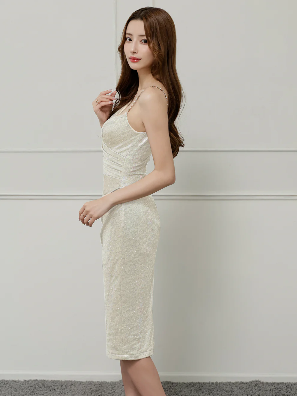 デコルテを美しく見せるVカットデザインと、肩にかかるチェーンストラップが女性らしさを引き立て、