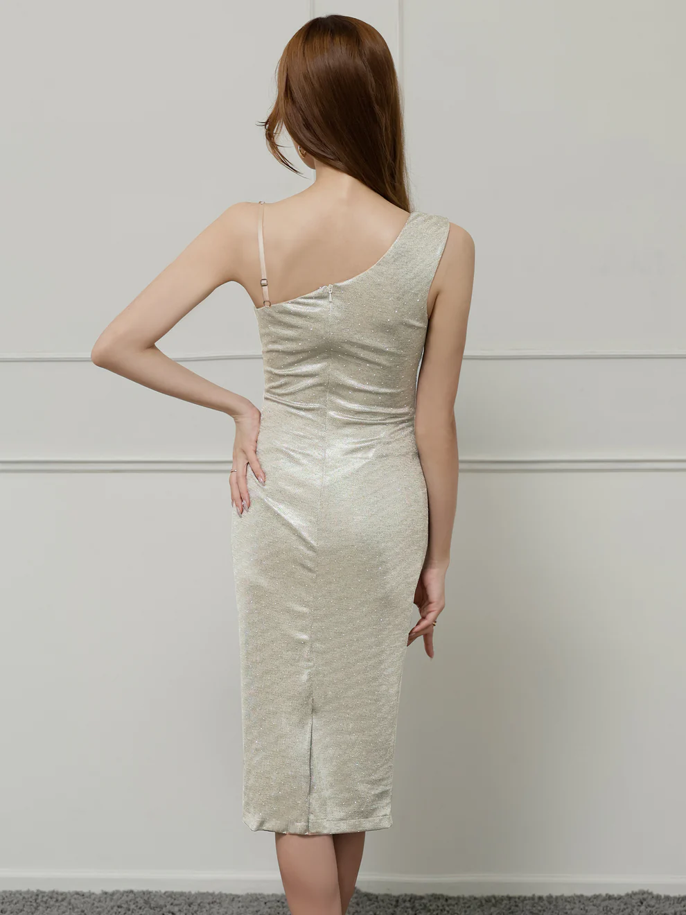 洗練された艶と気品を纏うミディアム丈ドレス。