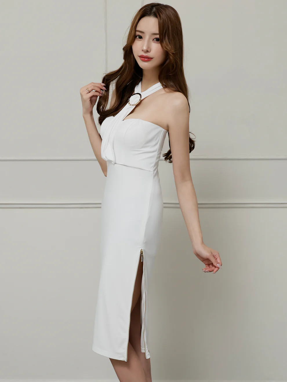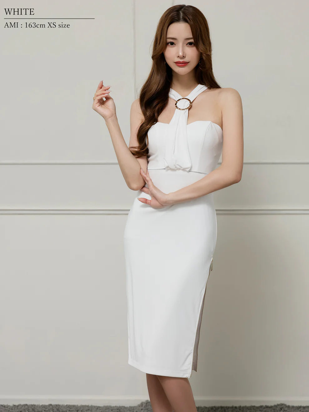 胸元のゴールドリングが艶やかに輝く、大人上品なホルターネックドレス。