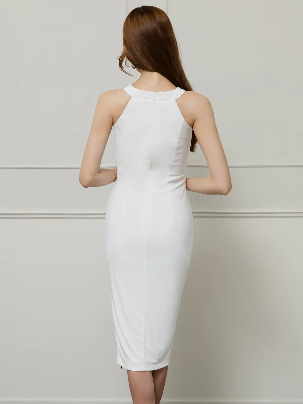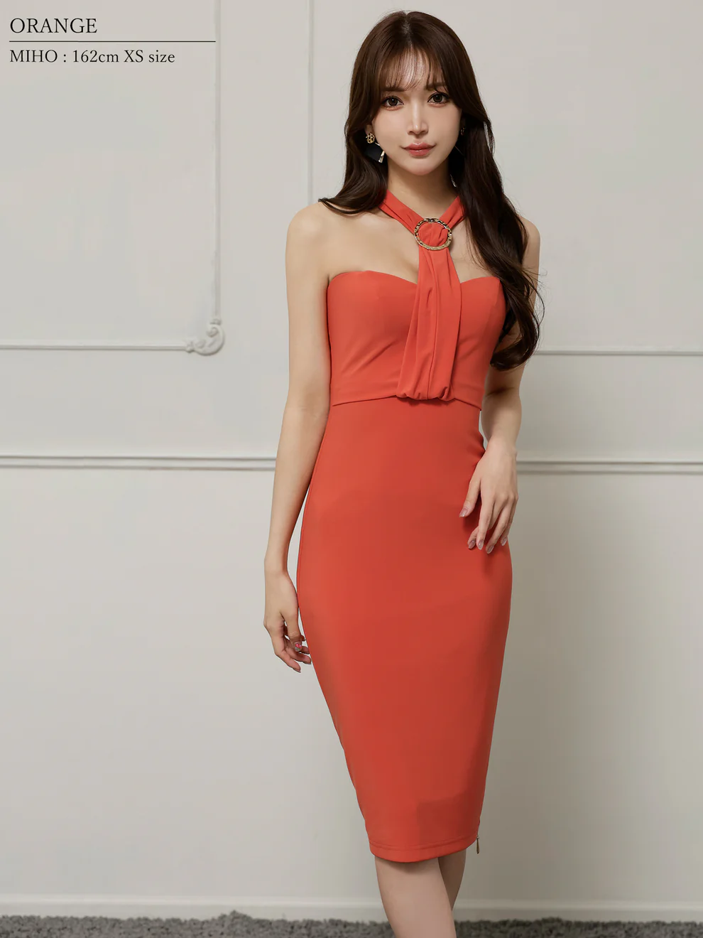 [Veautt] リング ホルターネック ドレープ ウエストマーク ストレッチ タイト ミディアムドレス グレー オレンジ ブラウン ホワイト 上品 セクシー 大人 かわいい ワンピース VT082524