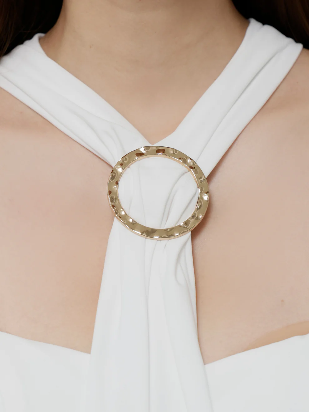 胸元のゴールドリングと美しいドレープラインが、洗練された印象を与える一着。