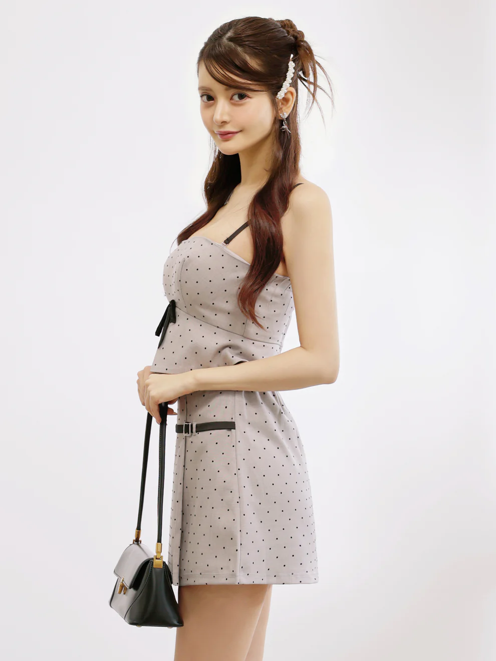 予約(12月上旬~12月中旬入荷予定)[AngelR] ドット柄 セパレート風 ペプラム ベアトップ フロントリボン 細ベルト フレア マイクロミニドレス ワンピース ホワイト ベージュ グレー 上品 清楚 大人可愛い 30代 40代 50代 体型カバー AR25256
