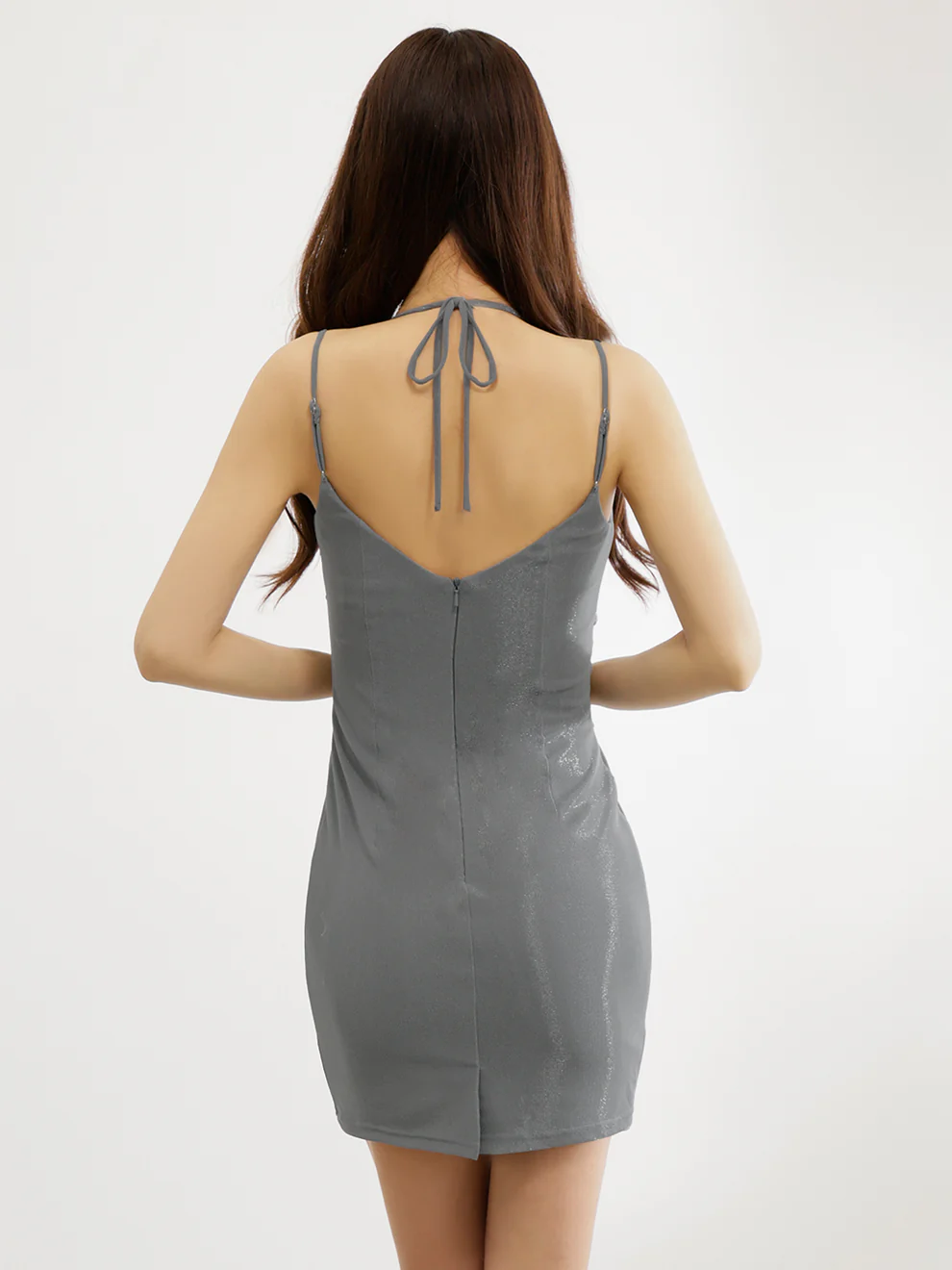 肩を華奢に見せる細ストラップと、デコルテを綺麗に魅せるすっきりデザインが魅力のタイトミニドレス。フロントに施した立体ツイストがウエストを引き締め、自然なメリハリラインを作り出します。