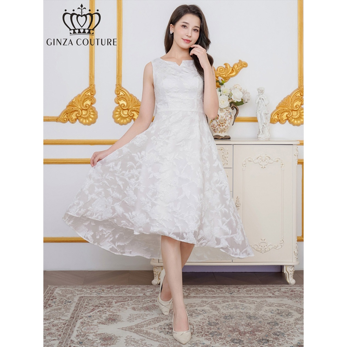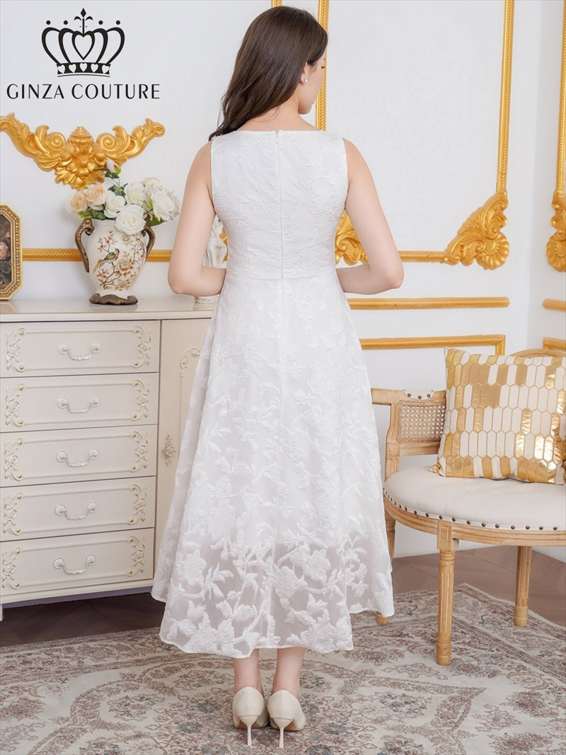 [GINZA COUTURE] ジャガード 花柄 スリットネック ノースリーブ フィッシュテール Aライン ミディアムドレス