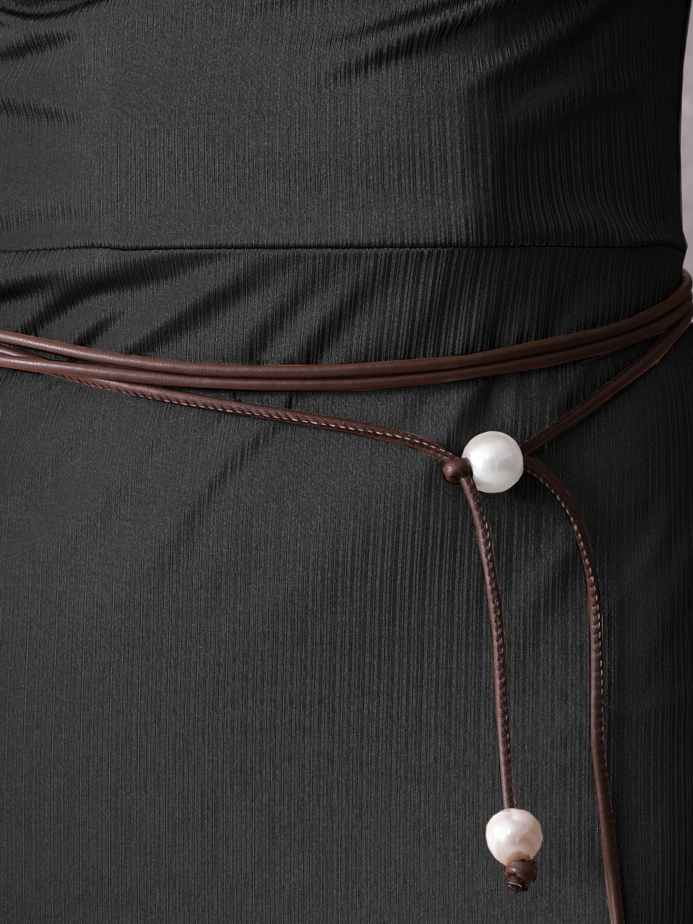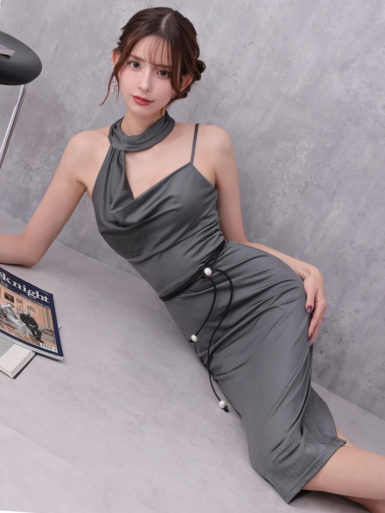アシンメトリーネックと流れるドレープが印象的なデザイン。身体に沿う美しいシルエットに、パール細ベルトを添え高級感を演出しています。
