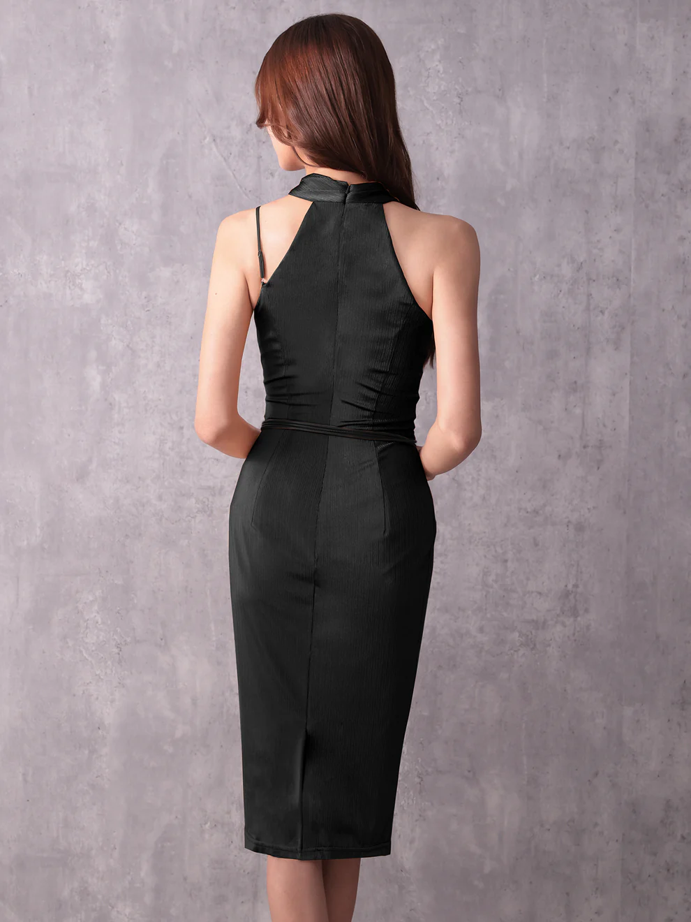 一枚で“大人の品格”を纏うミディ丈タイトドレス。