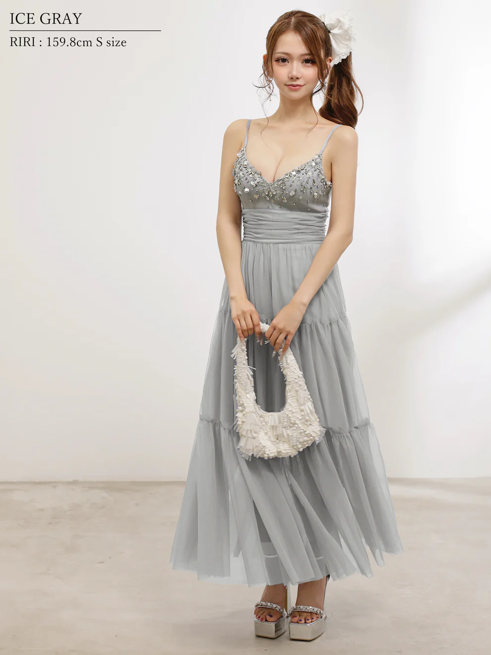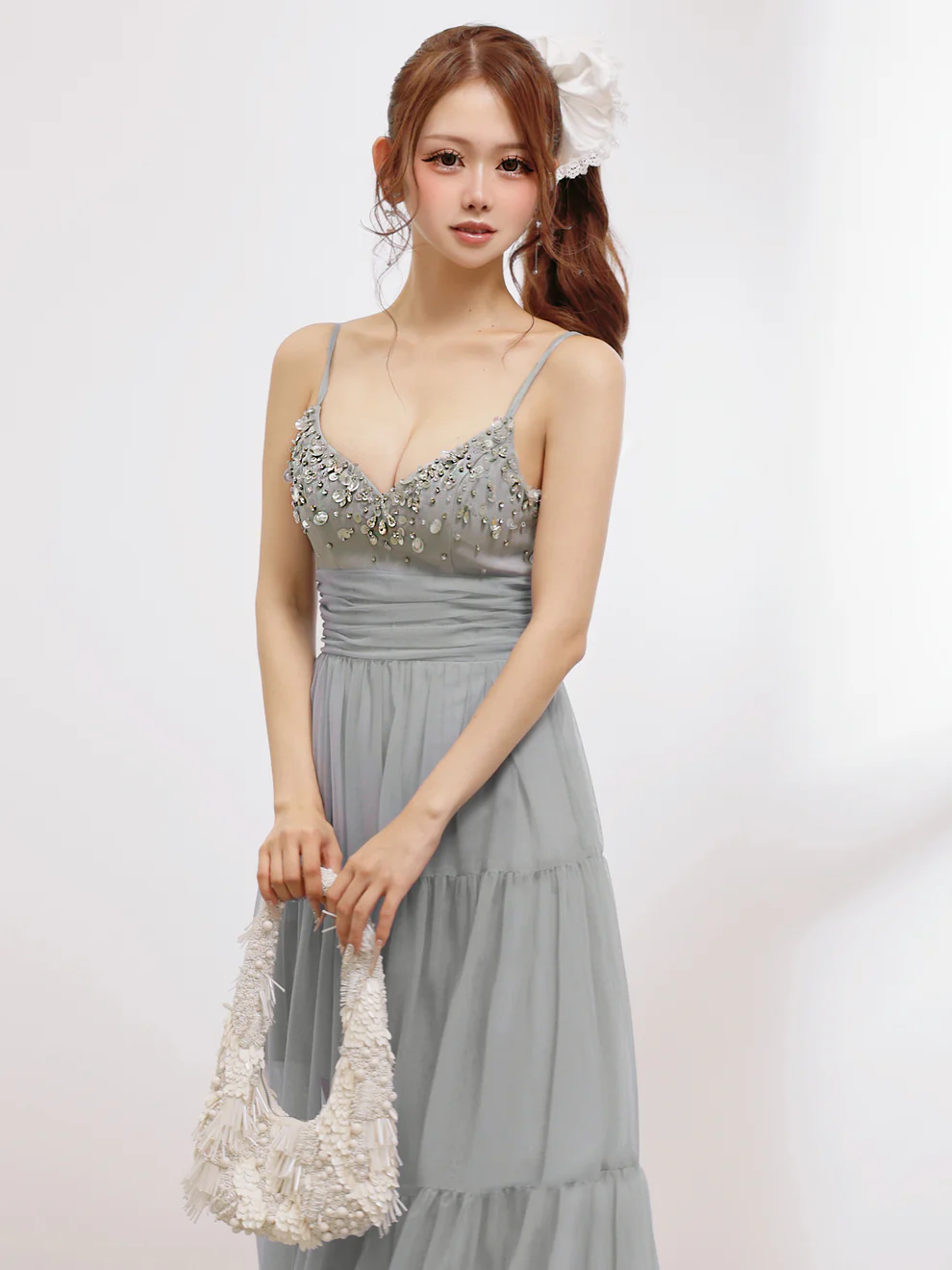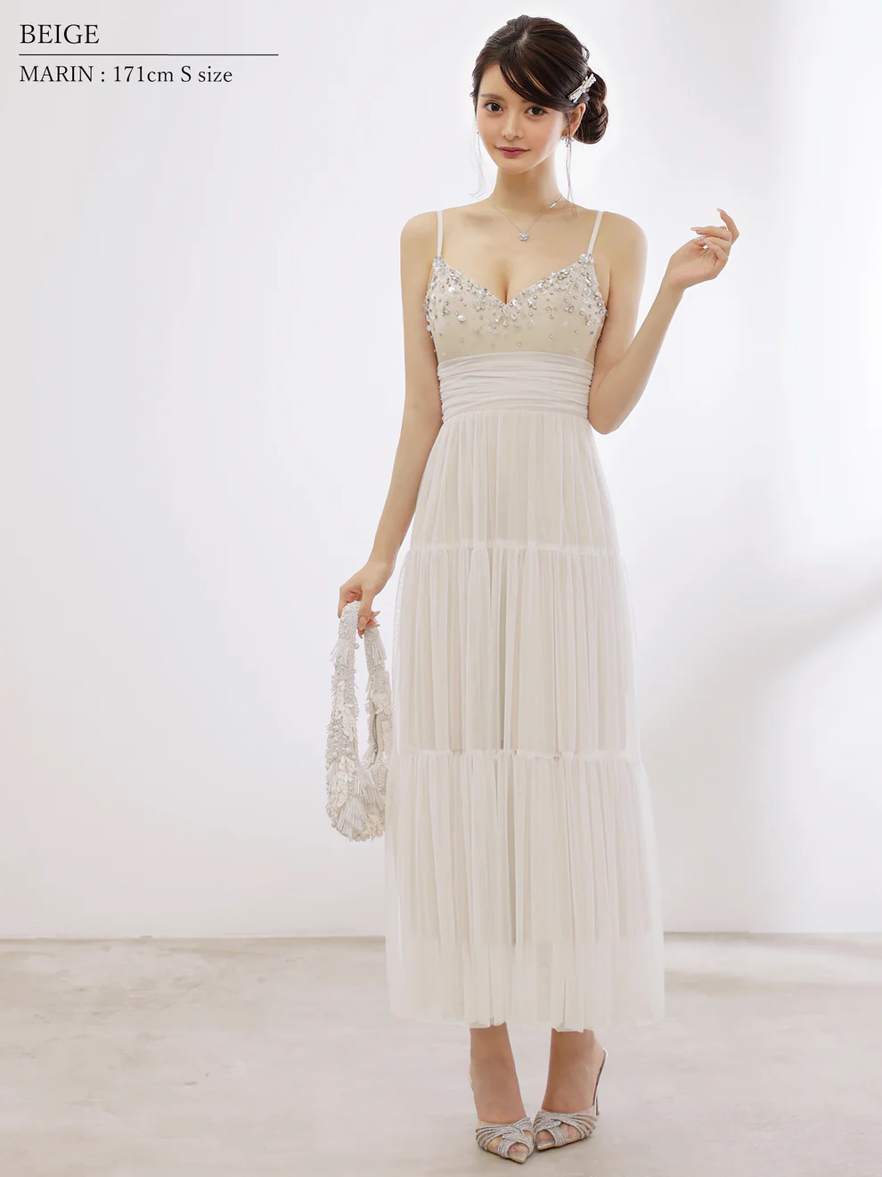 ロングドレス/キャミドレス/ティアード/チュール/ビジュー/フレアロング/キャバドレス/マキシ丈/上品/イベントドレス