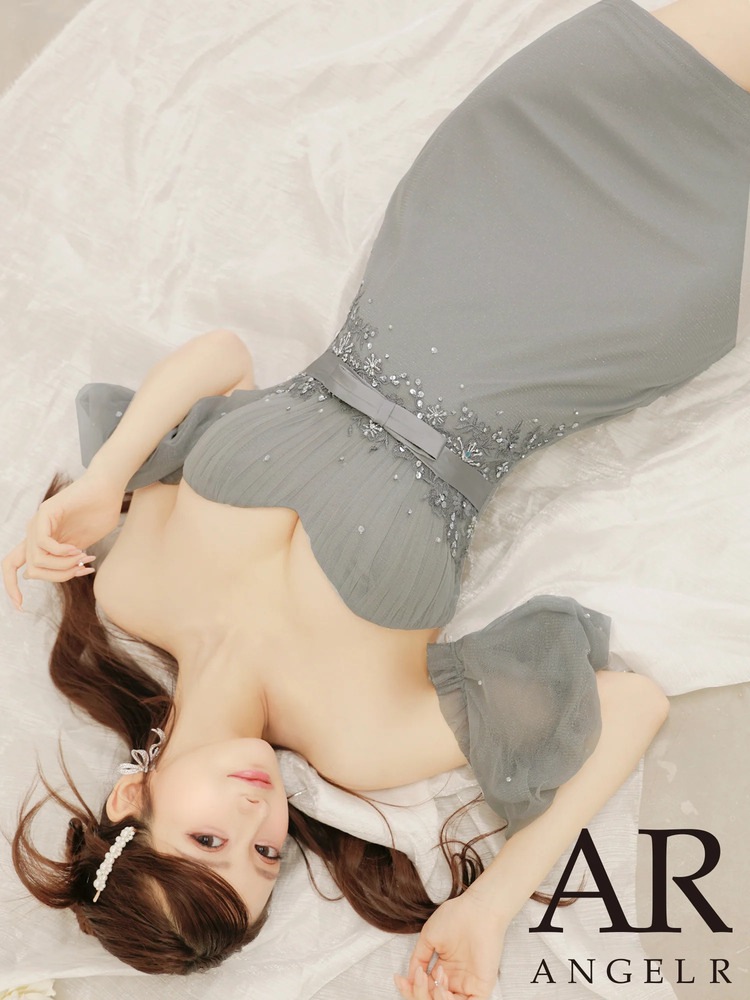 予約(12月上旬~12月中旬入荷予定)ビジュー刺繍×チュールパフスリーブ 2WAY ハートカット タイト ミニドレス グレー ベージュ アイボリー ティールブルー ピンク AR25876【AngelR/エンジェルアール】