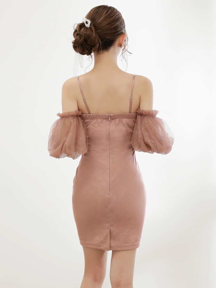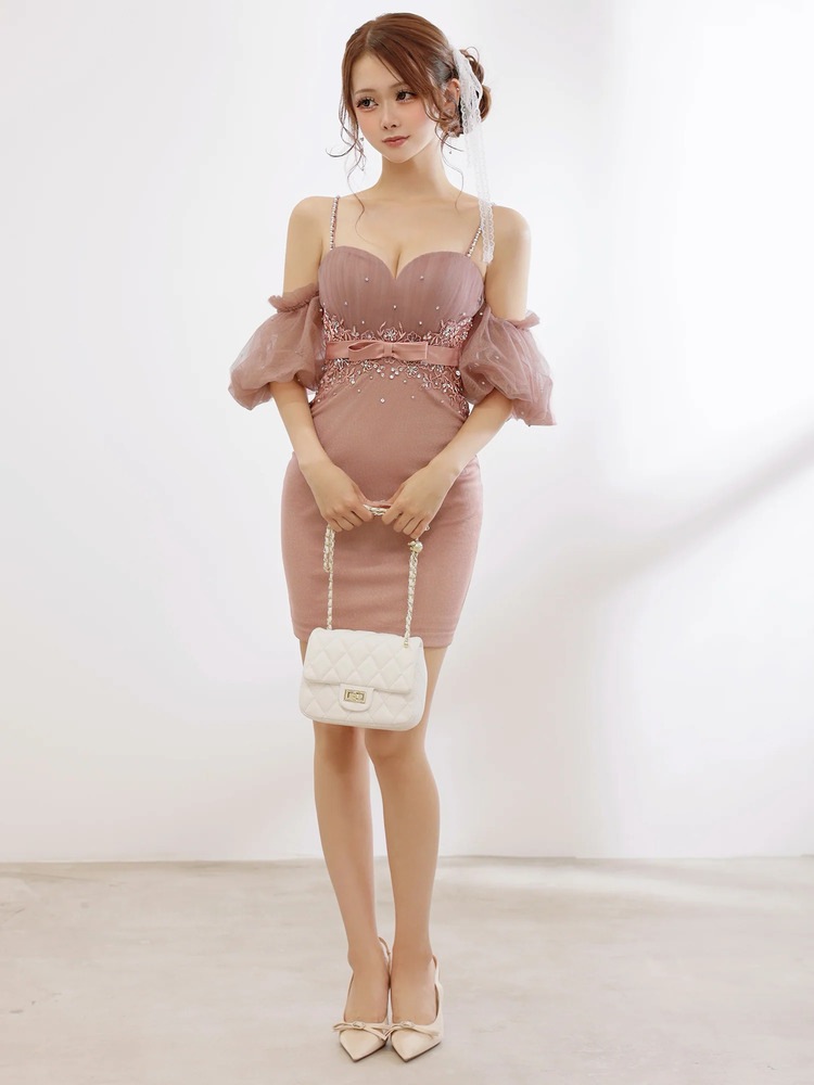 ビジュー刺繍/チュールパフ袖/2WAYドレス/ハートカット/タイトミニ/上品ミニドレス/高見え・着映えデザイン
