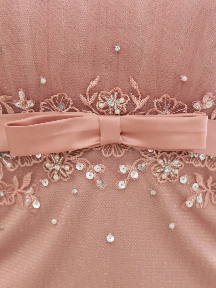 細やかなビジュー刺繍と立体的なチュールディテールが、胸元からウエストにかけて輝きを放つ高見えデザイン。 ハートカットのデコルテラインが顔周りを明るく見せ、華奢見え効果も抜群です。