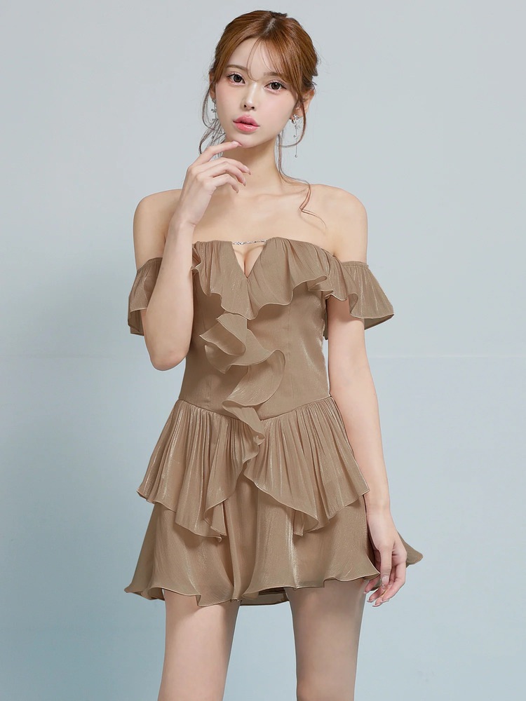 華奢ショルダー×立体フリルが視線を惹きつける、フェミニンオフショルドレス。