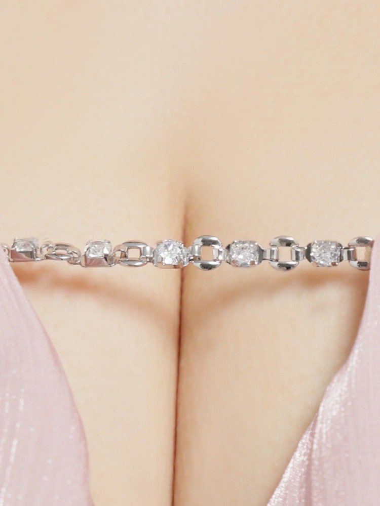 胸元にはバストカットとビジューチェーンを施し、デコルテを美しく強調。