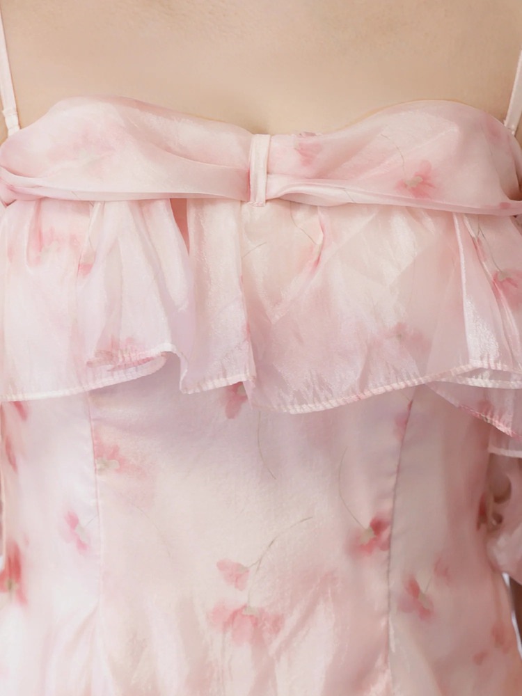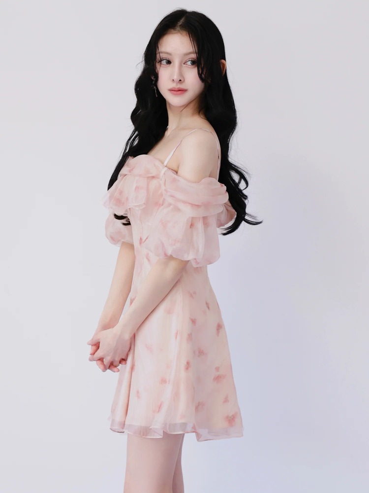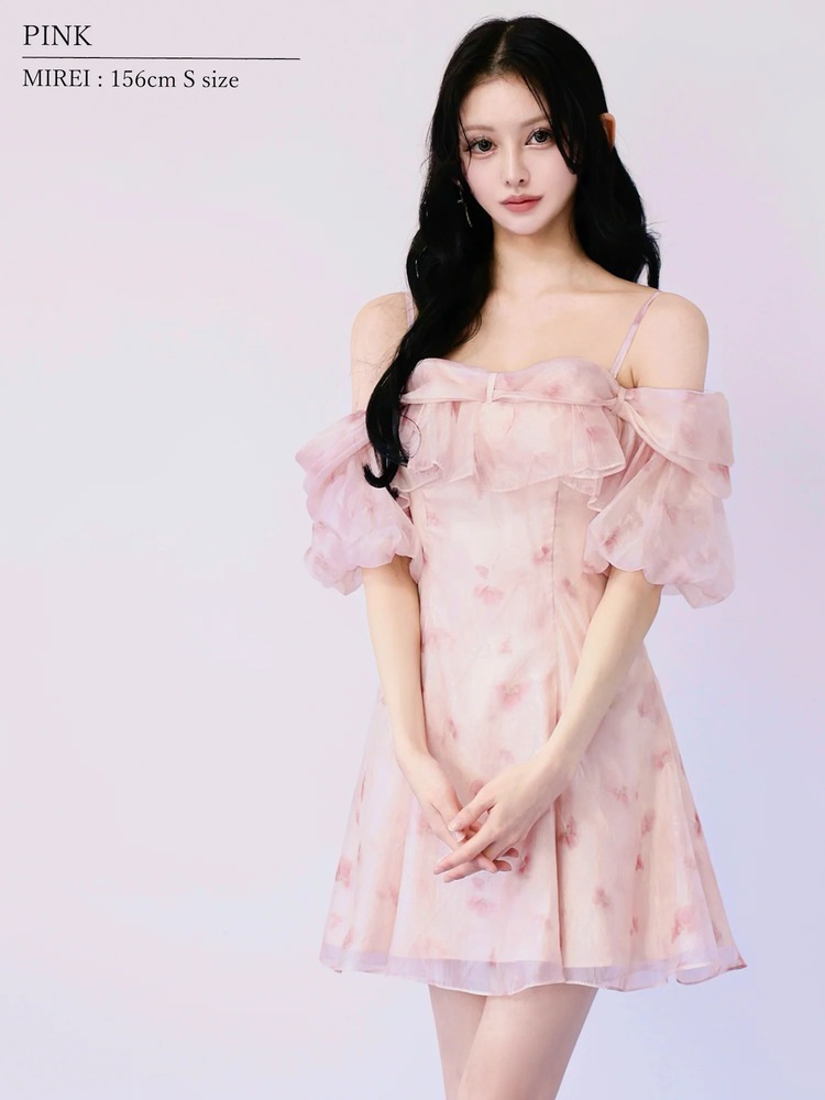 AngelR AR26802 フリル オフショル 2WAY シフォン フレア ミニドレス|肩紐付き 上品 フェミニン キャバドレス ピンク サックス