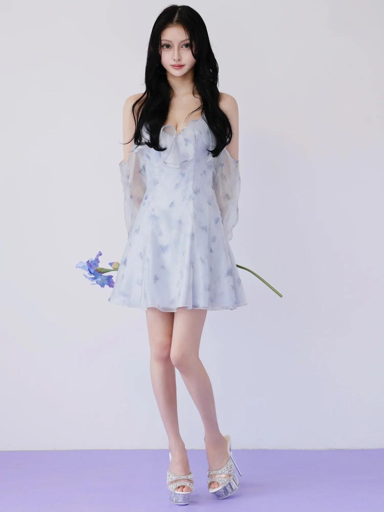 キャバドレス/ミニドレス/フリルドレス/ シフォンドレス/フラワープリント/プリーツ/ AngelR/フェミニン/ナイトドレス