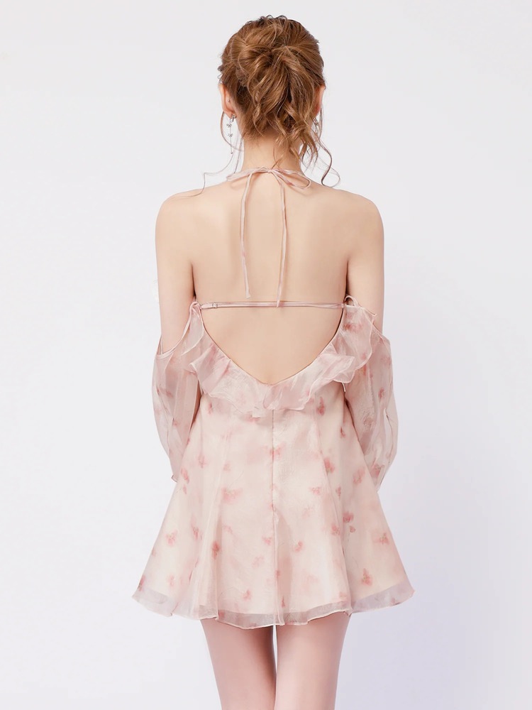透け感のあるシフォン素材にフラワープリントを施した、軽やかなミニドレス。