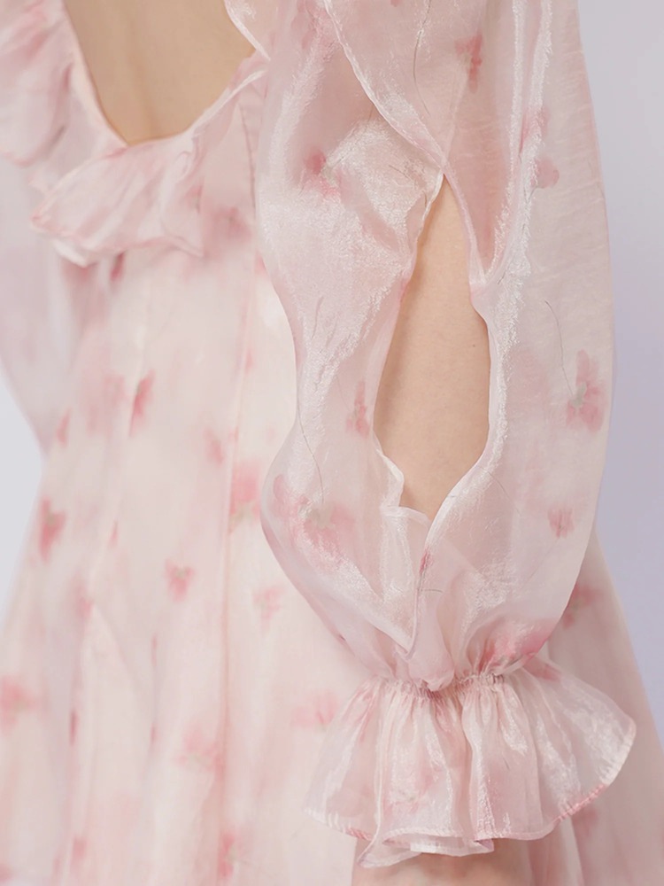 AngelR AR26801 フリル シフォン フラワープリント ミニドレス|プリーツ ノンストレッチ パッド付き 背中ファスナー フェミニン キャバドレス サックス ピンク