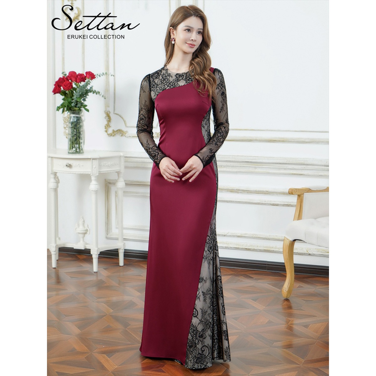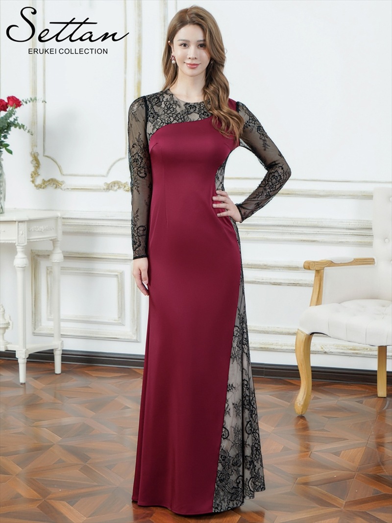 [SETTAN] サテン×レース 長袖シアー マーメイド ロングドレス