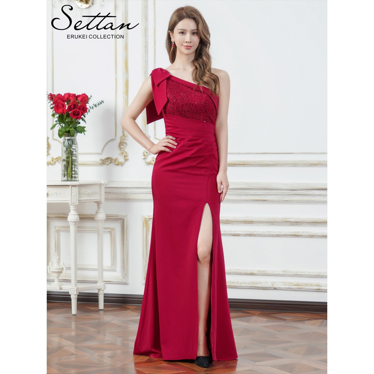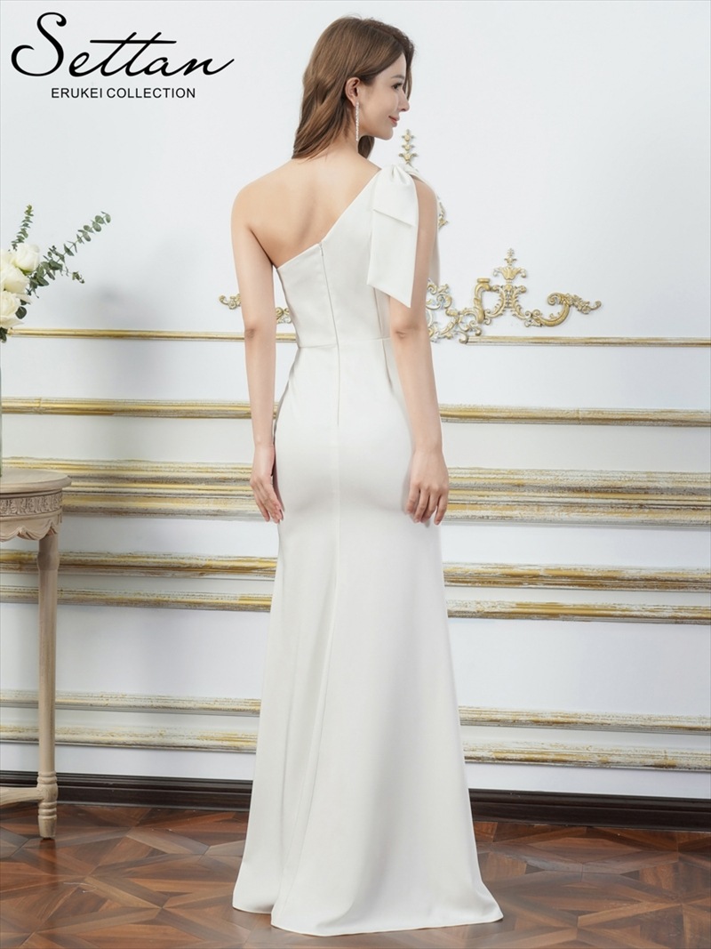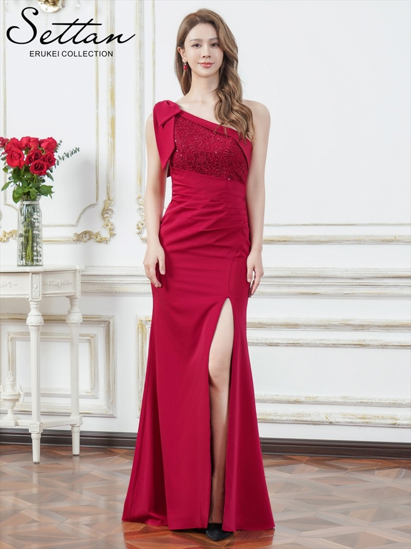 [SETTAN] 2color ワンカラー サテン レース スパンコール ワンショルダー 肩リボン ギャザー スリット タイト マーメイド ロングドレス ホワイト ワインレッド モダン シック キュート フォーマル ゴージャス 大きいサイズ 特別なイベント 衣装 撮影 演奏会 発表会 雪丹 LK S37503