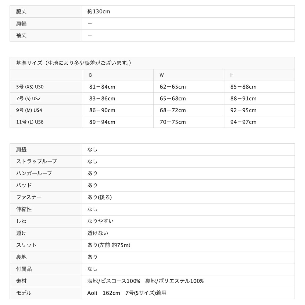 - 左前スリットで歩きやすく、程よい色気も演出