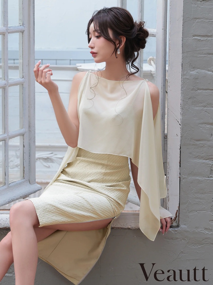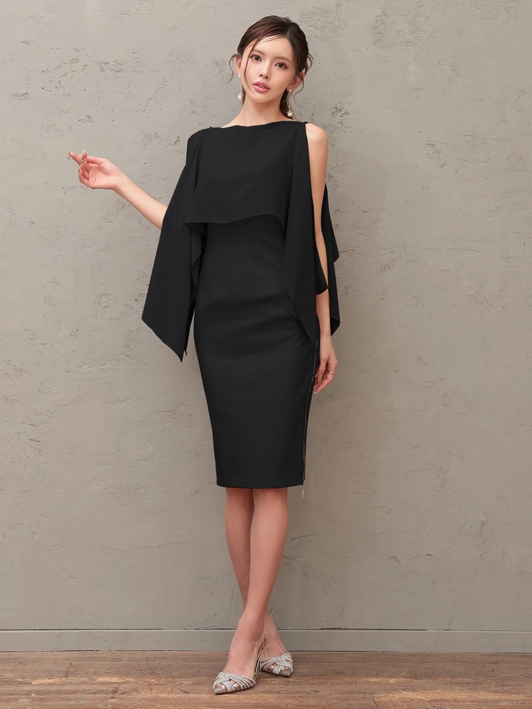 ミディアムドレス / タイトドレス / 2WAY / ケープ / シフォン / オープンショルダー / レイヤード / 体型カバー / 二の腕カバー / 上品 / 品格 / 落ち着き / 30代 / 40代 / 50代 / クラブ / ラウンジ / 同伴 / 結婚式二次会 / パーティ / ホテルディナー / Veautt