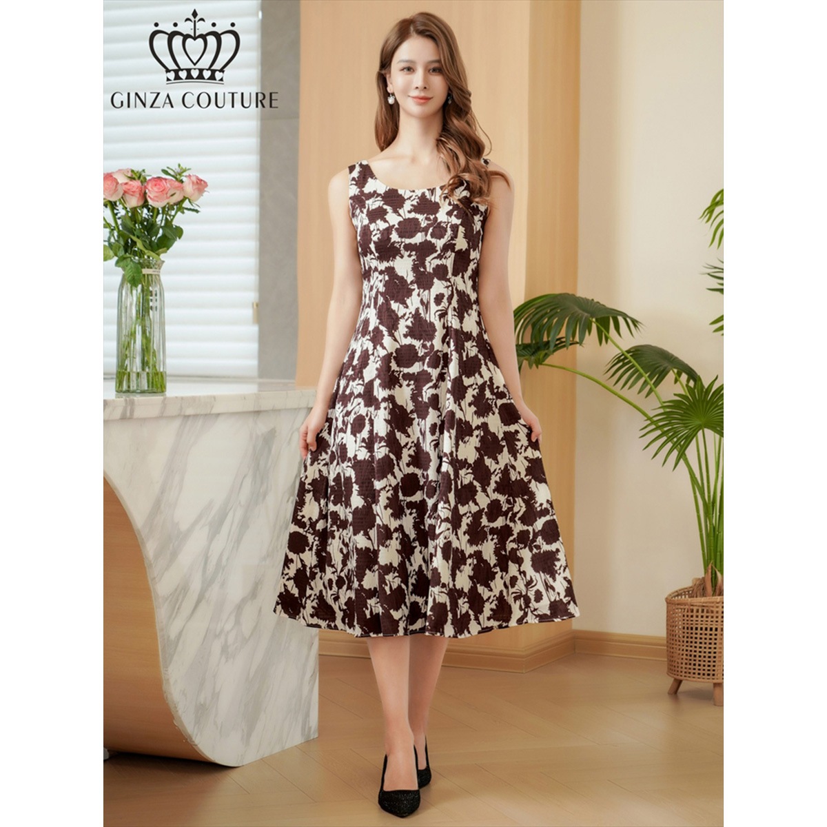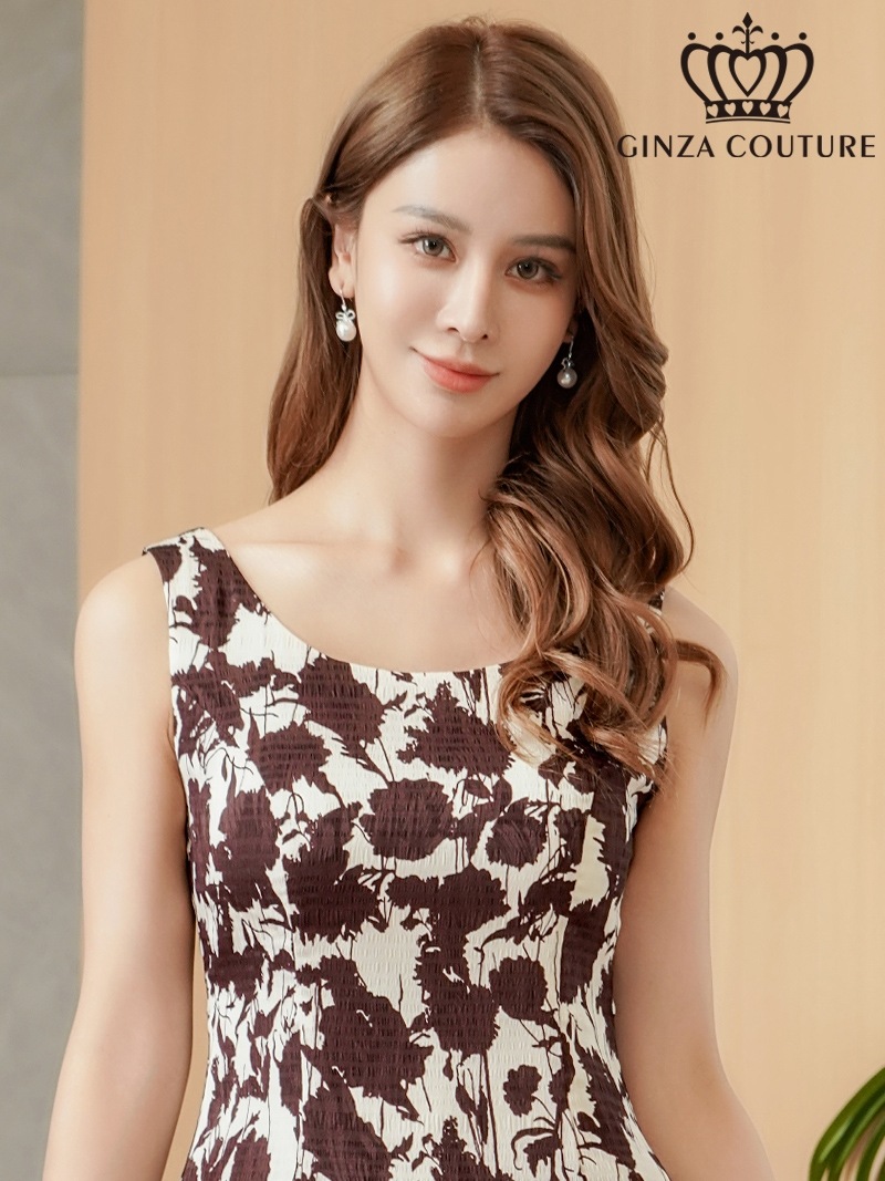 [GINZA COUTURE] 1color 花柄 プリント ノースリーブ Aライン ミディアムドレス ワンピース