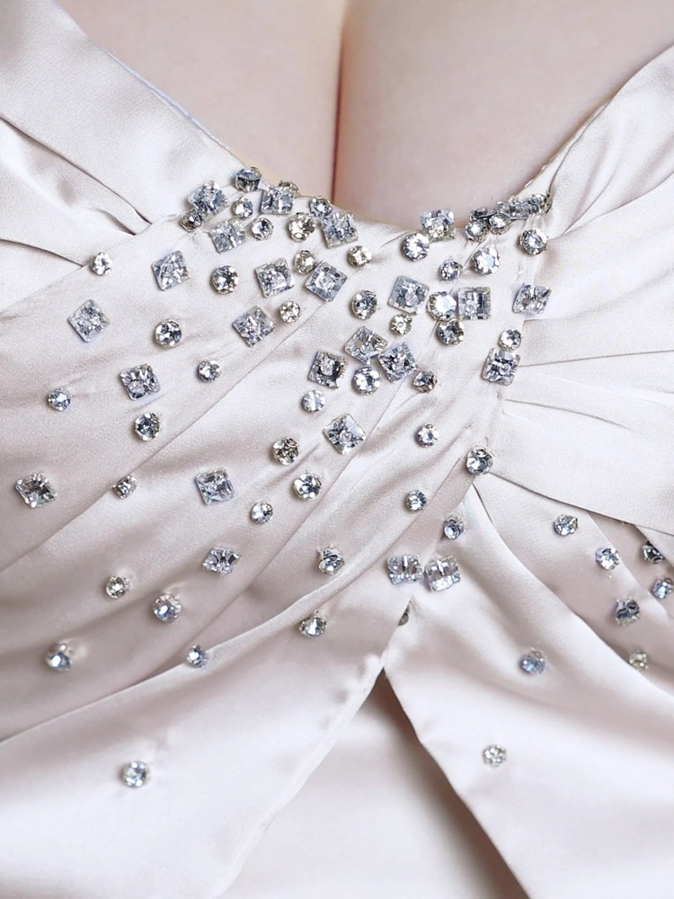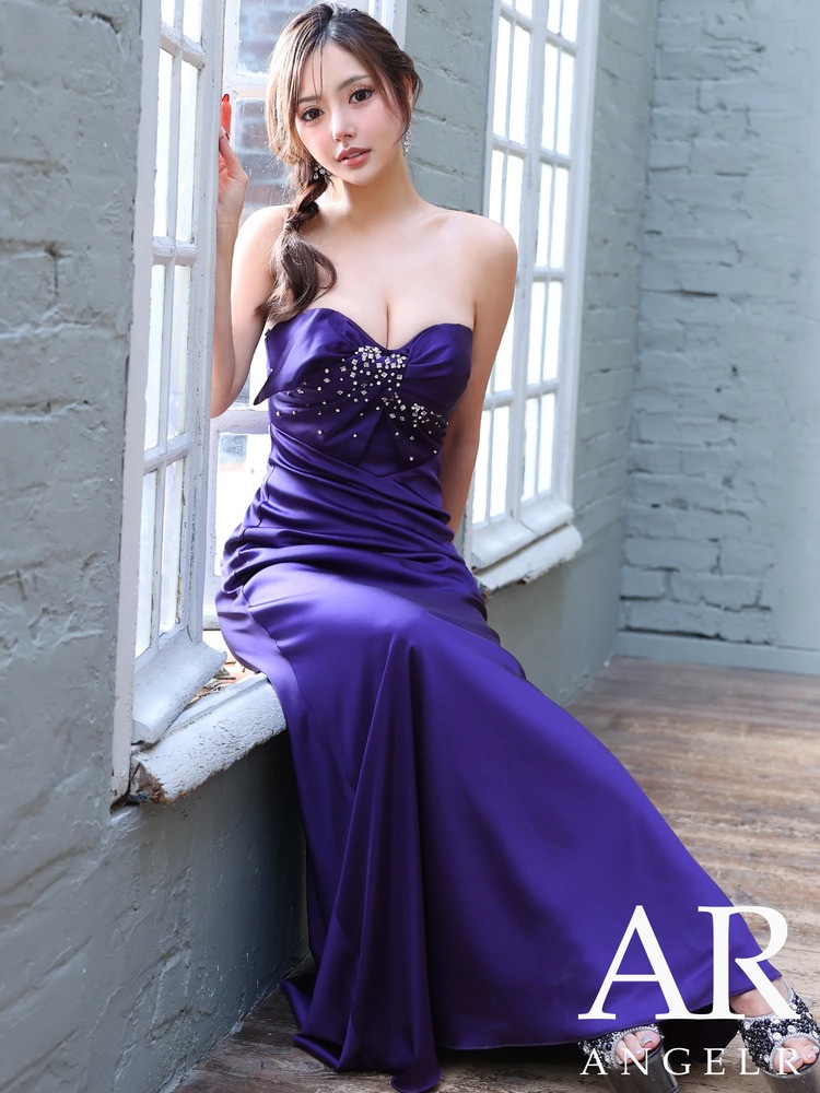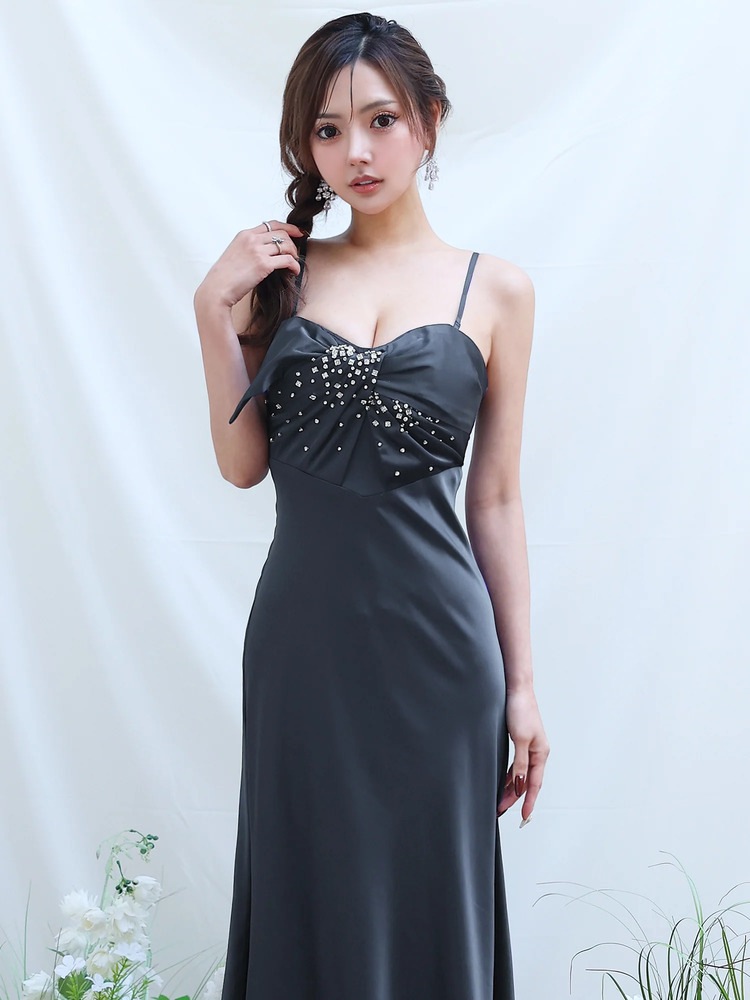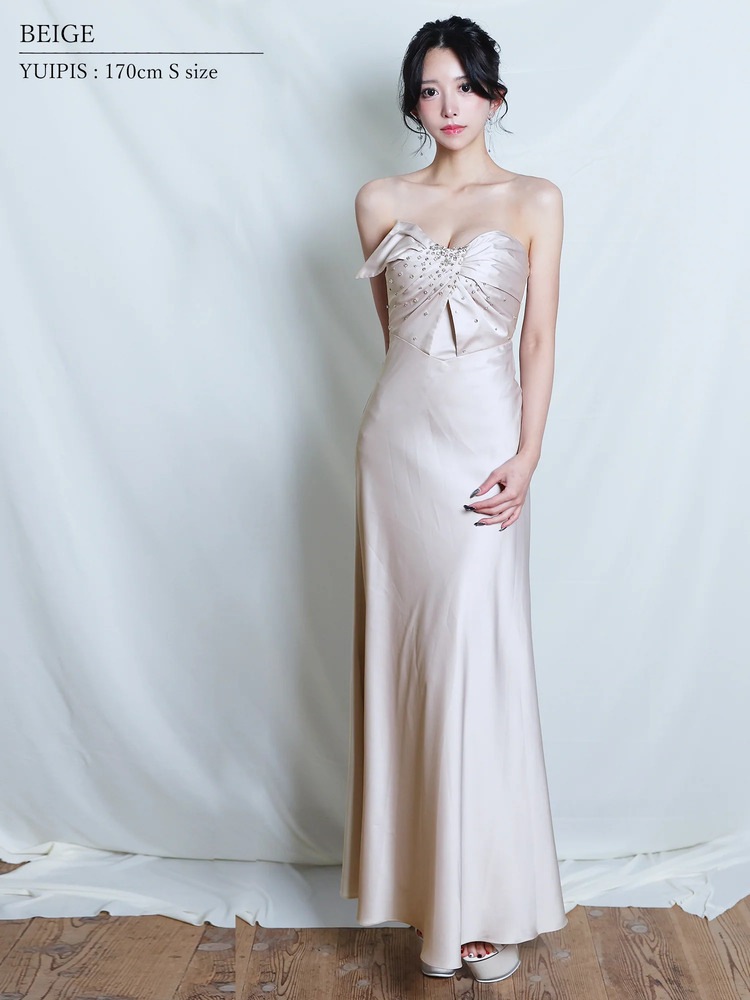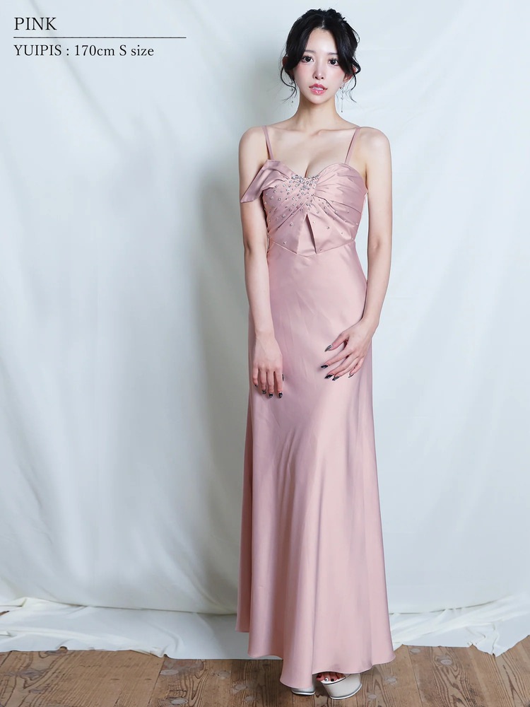 フロントドレープ×ビジューが華やかに映える、2WAYベアトップのストレッチサテンロングドレス。ピンク・パープル・ダークグレー・ベージュの4色展開で、キャバやパーティー、発表会にもおすすめ。