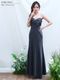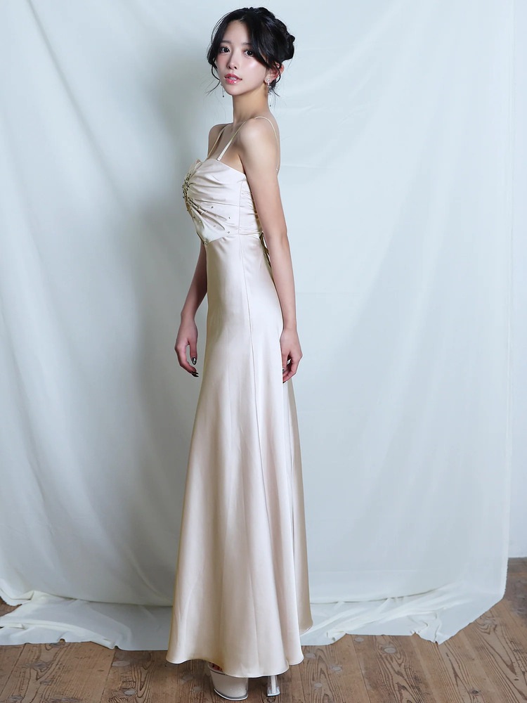 胸元に立体的なドレープを施し、ビジューとビーズ装飾で上品な華やかさを演出するAngelRのロングドレス。