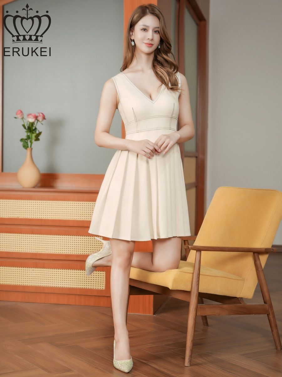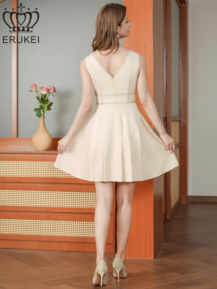 [ERUKEI] ステッチライン Vネック ノースリーブ ハイウエスト プリーツ Aライン フレア ミニドレス ワンピース アイボリー 清楚 きれいめ パーティ 結婚式 披露宴 2次会 発表会 演奏会 会社 ビジネス お食事会 デート 撮影 衣装 ナイトドレス 大きいサイズ LK エルケイ E25116