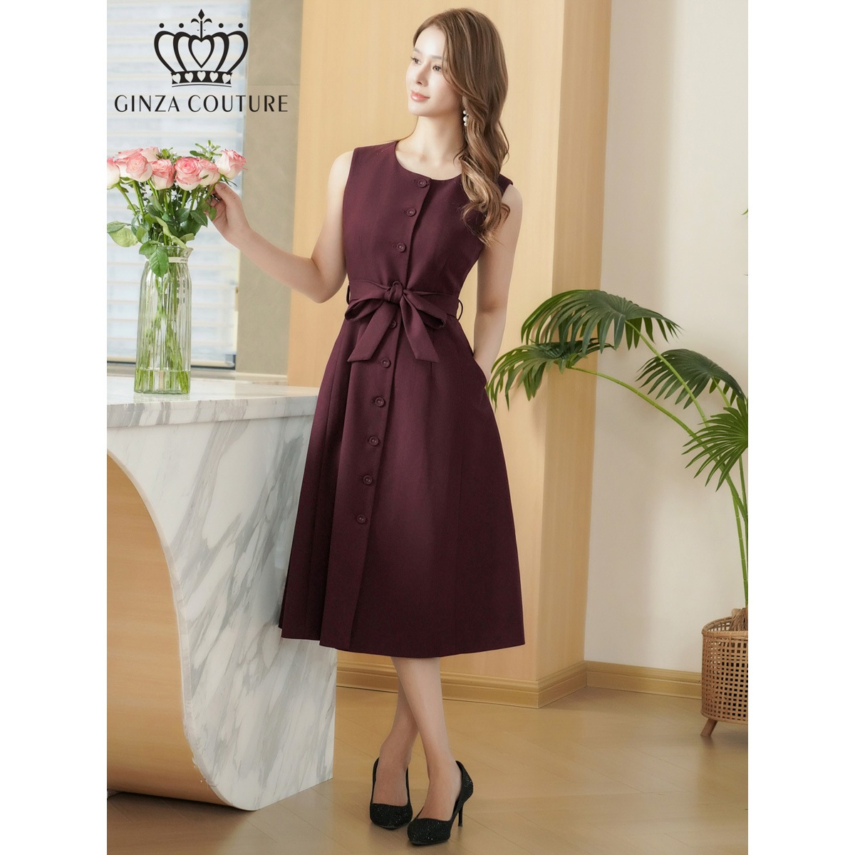 [GINZA COUTURE] シンプル ノースリーブ 前ボタン リボンベルト Aライン ミディアムドレス