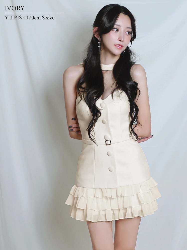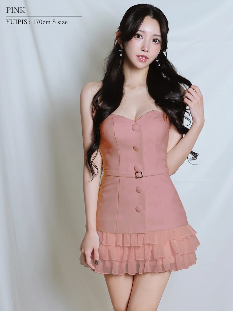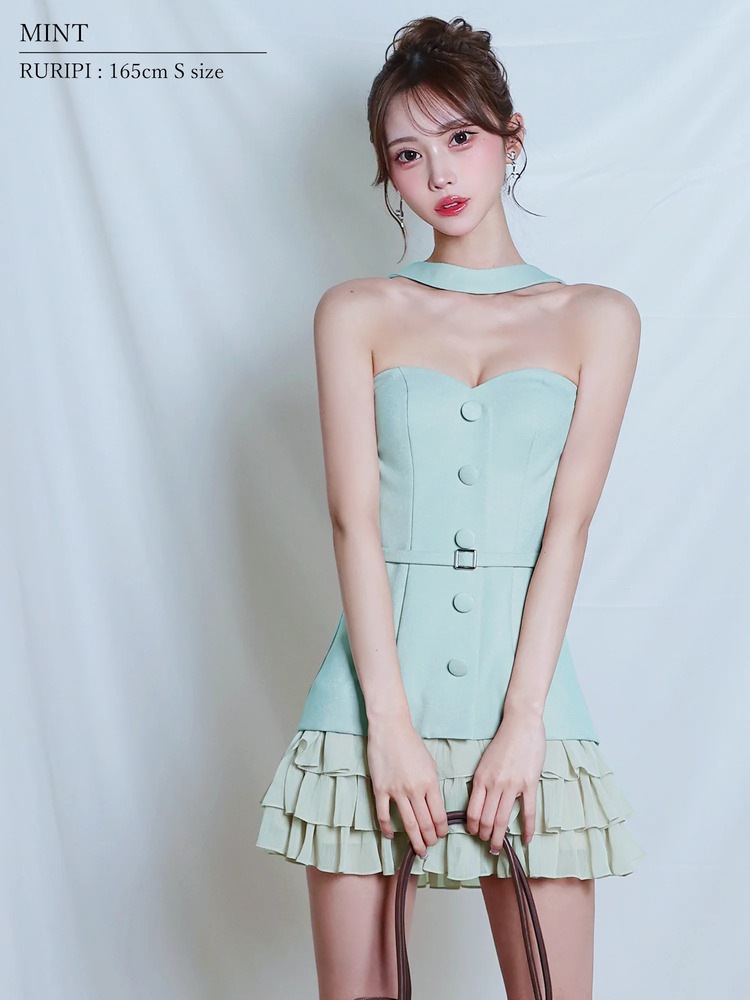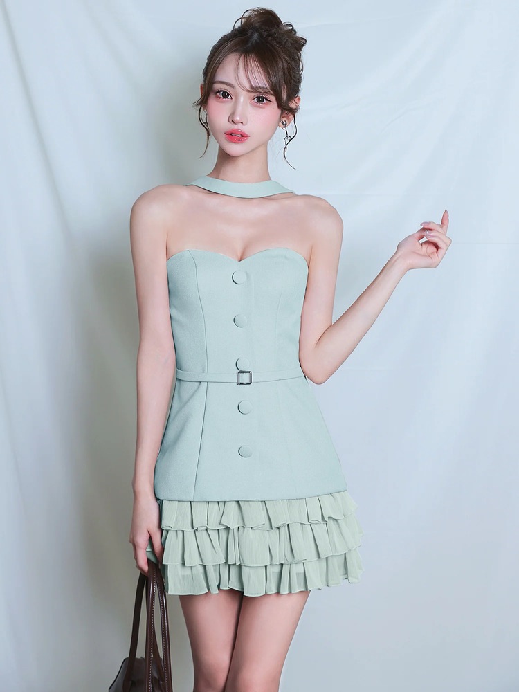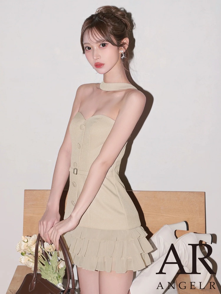 AngelR フロントボタン 立体切替 ウエストベルト フリルフレア チョーカー取外し2WAY ベアトップ マイクロミニドレス AR26208