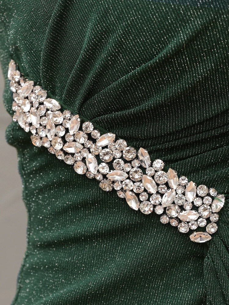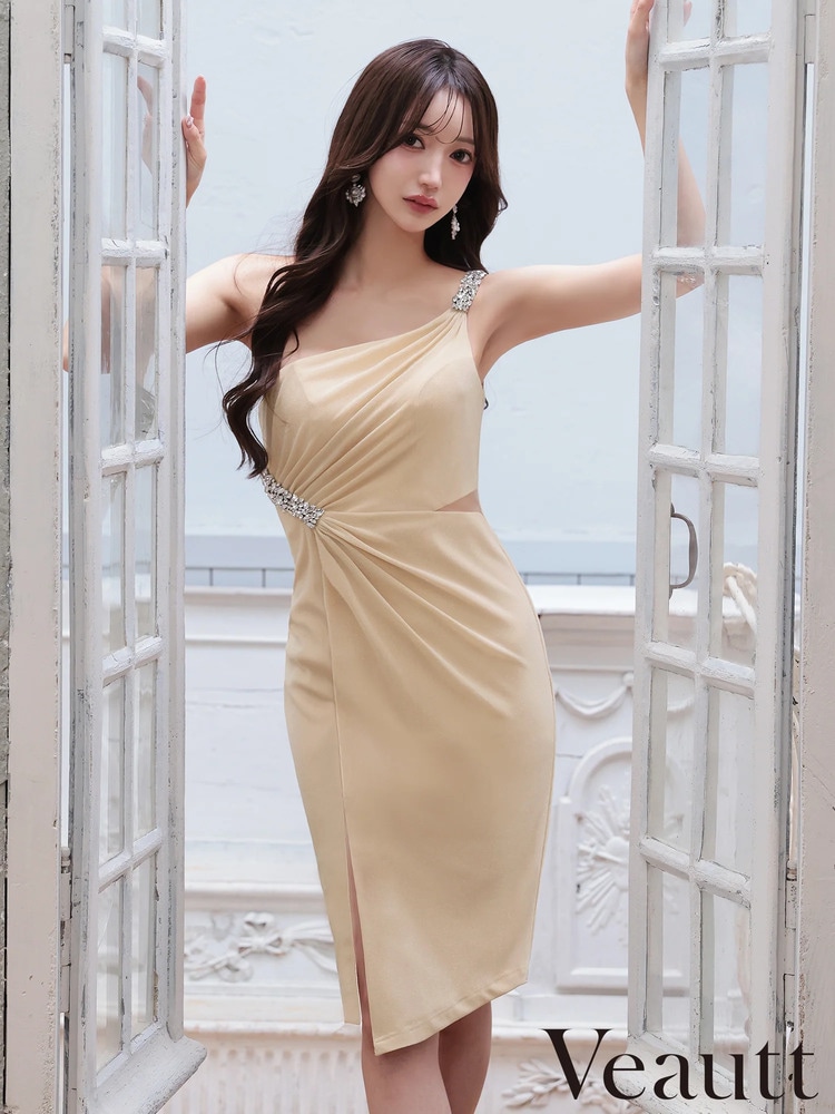 【予約】(3月中旬~3月下旬入荷予定)【Veautt/ヴュート】ラメワンショルダー ビジュー×ウエストカット ドレープタック スリット タイトミディドレス VT032604