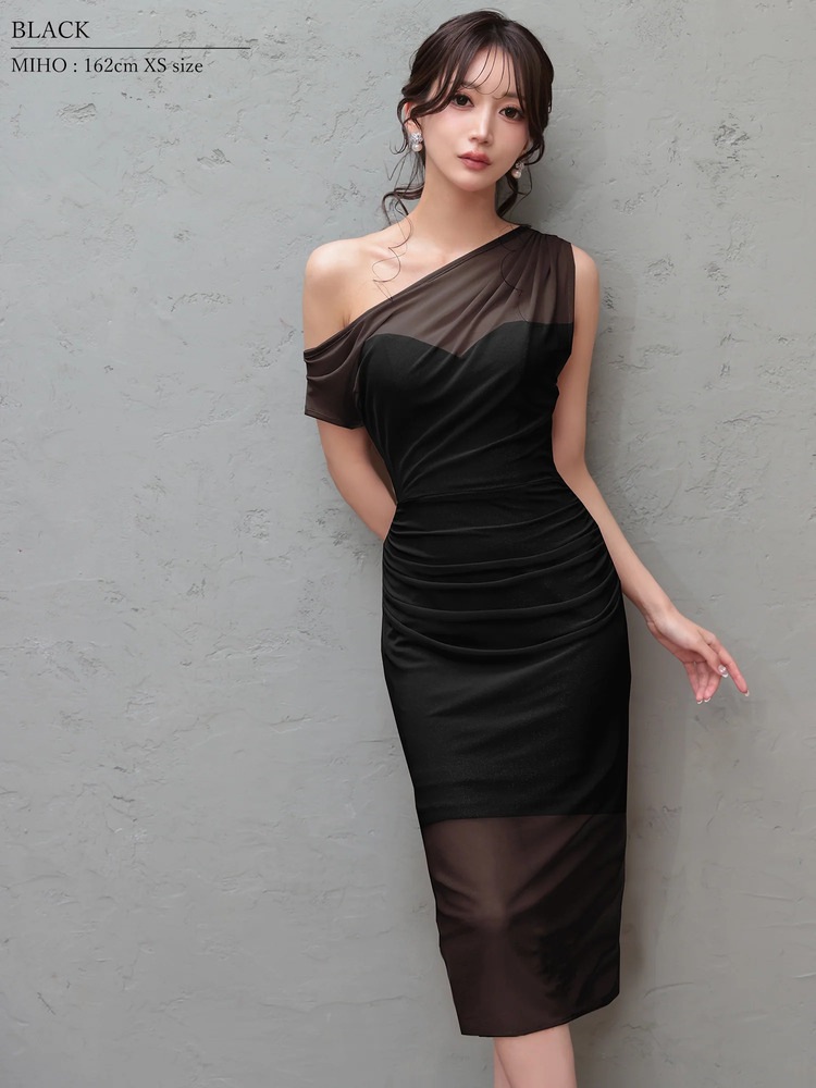 【予約】(3月中旬~3月下旬入荷予定)【Veautt/ヴュート】ワンショルダー アシメドレープ×裾シアー メッシュ スリット タイトミディドレス VT082604