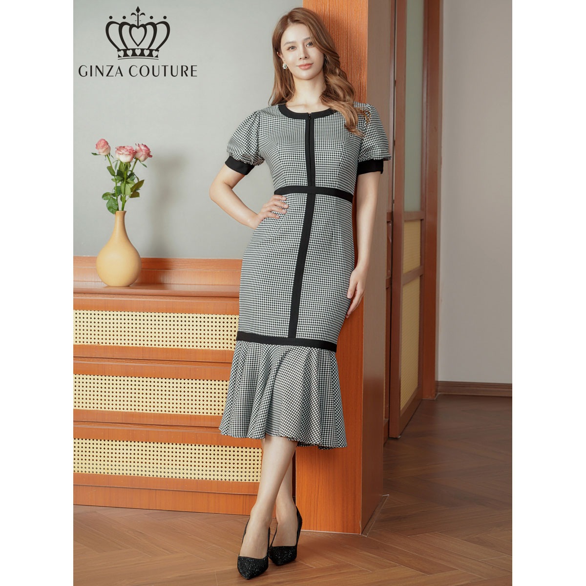 [GINZA COUTURE] 千鳥格子柄 パフスリーブ 半袖 ブラック切替 タイト マーメイド ミディアムドレス ワンピース