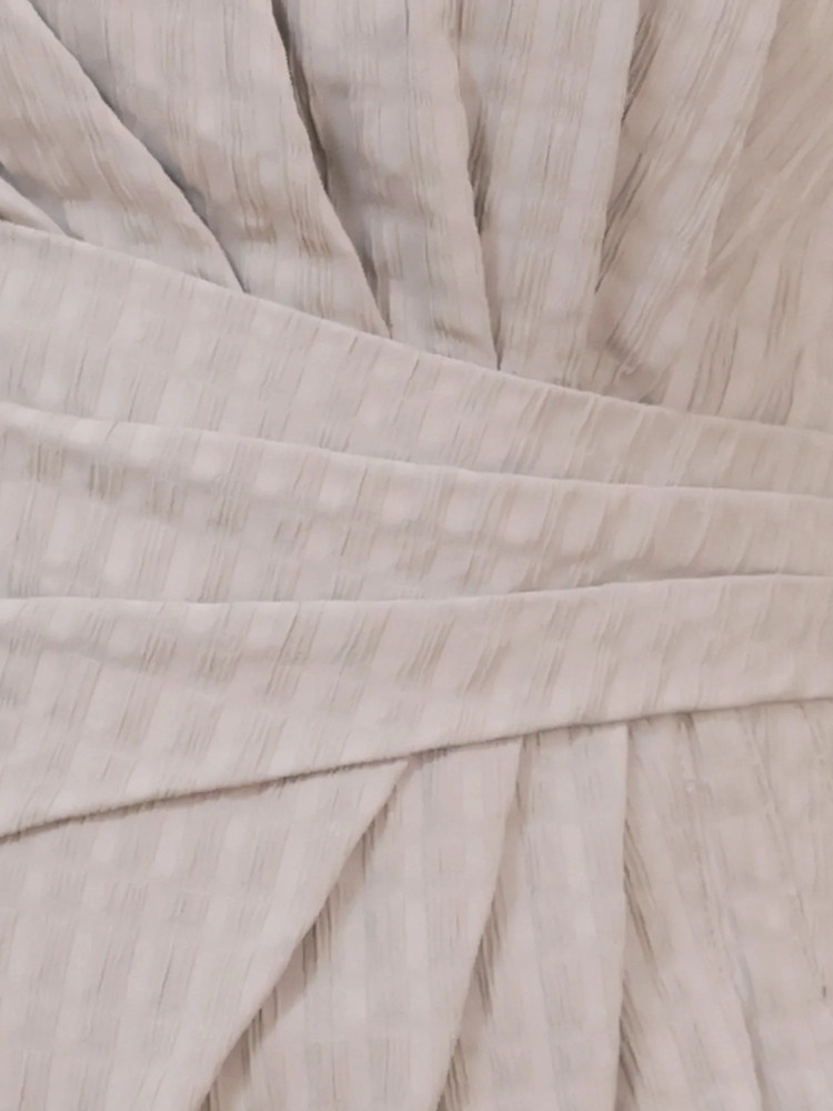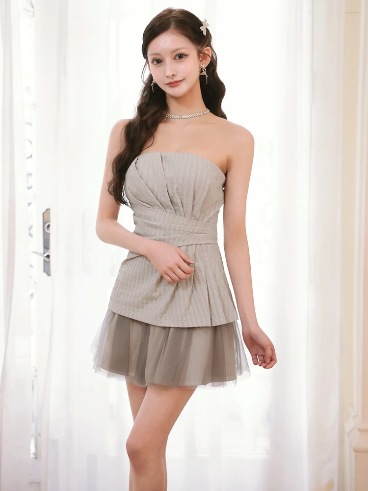 素肌に溶け込むような繊細な生地感と、やわらかく寄せたギャザーデザインが印象的なベアトップドレス。立体的な切り替えでウエストラインを包み込み、自然なくびれをつくりながら上品なシルエットへ導きます。
