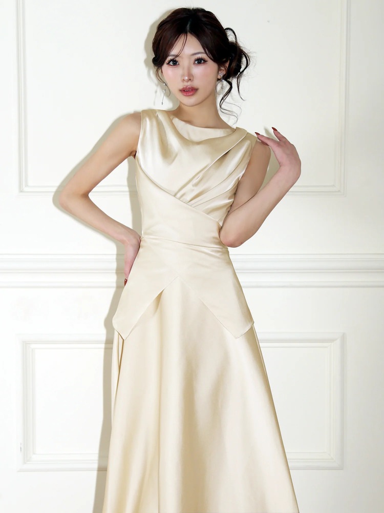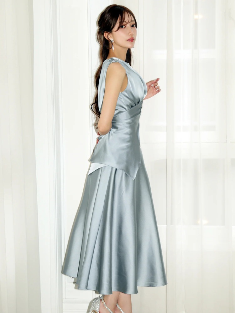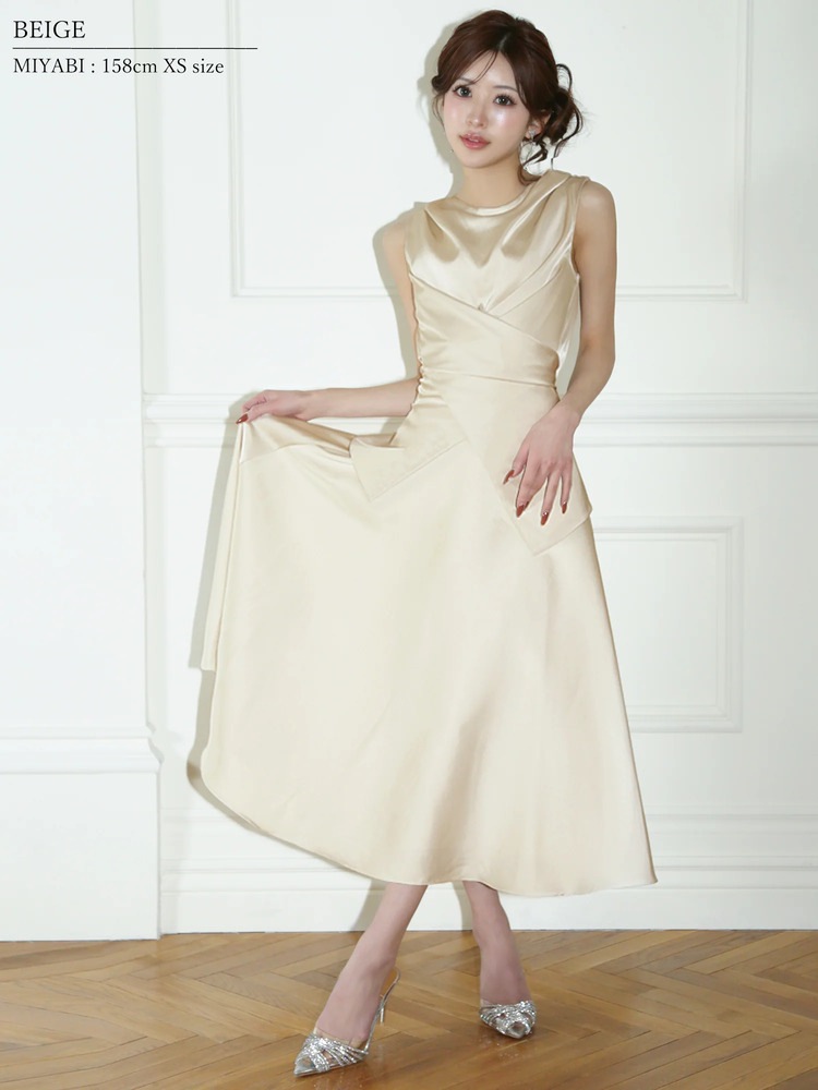 [Veautt] サテン ドレープ ウエストクロス リボン セパレート フレア ミディアムドレス
