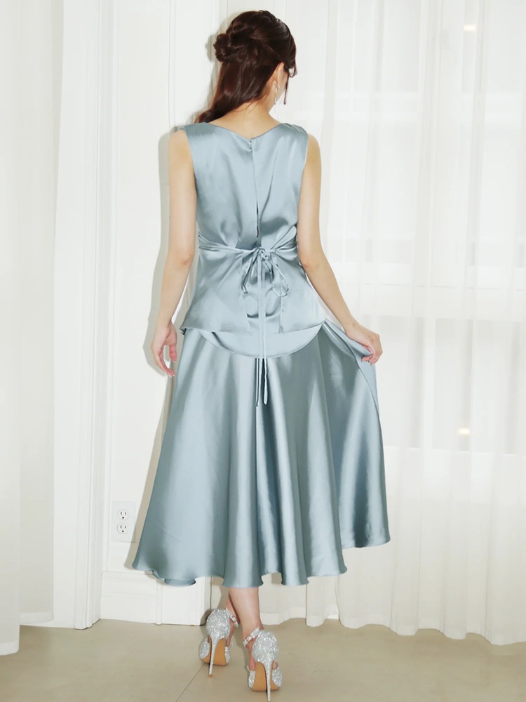 Veautt ヴュート サテン ドレープ ウエストクロス リボン セパレート セットアップ フレア ミディアムドレス ノースリーブ 上品 高級感 結婚式 パーティ 二次会 お食事会 発表会 演奏会 撮影 衣装 ブルー ベージュ ブラック